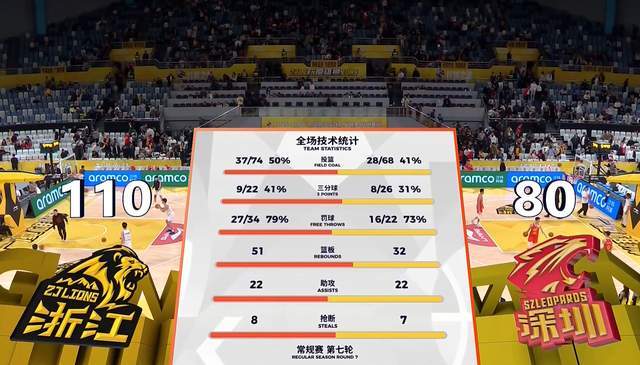 廣廈隊6人得分上雙,孫銘徽11分,胡金秋11分5籃板,桑普森11分10籃板,布朗14分,塔克21分5助攻,趙巖昊13分,卡爾頓9分11籃板。