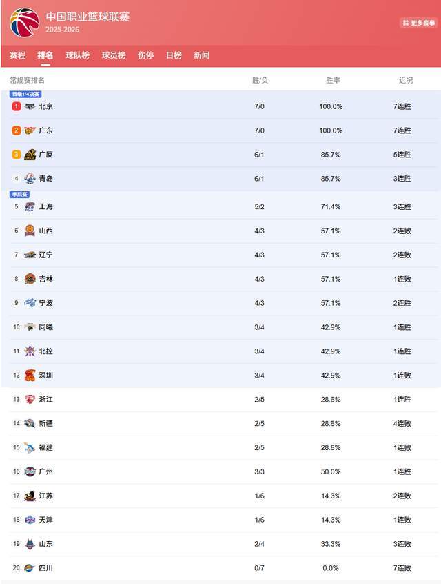 北京和廣東在本輪比賽中繼續(xù)保持全勝,展現(xiàn)出強(qiáng)大的整體實(shí)力。北京隊?wèi){借穩(wěn)定的攻防表現(xiàn),客場96-70輕取福建隊,7連勝,繼續(xù)占據(jù)積分榜首位;廣東隊則依靠團(tuán)隊配合和關(guān)鍵球員的發(fā)揮,緊咬比分,客場95-89擊敗山西隊,同樣7連勝,和北京隊并駕齊驅(qū),領(lǐng)跑積分榜。