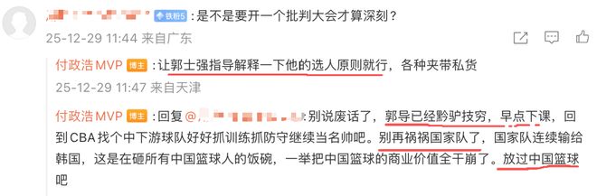 付政浩在和網(wǎng)友互動(dòng)時(shí)直言:“又開啟了新一輪裝模做樣的CBA球員考察”,并且一針見血指出:“郭導(dǎo)已經(jīng)黔驢技窮,早點(diǎn)下課,回到CBA找個(gè)中下游球隊(duì)好好抓訓(xùn)練抓防守繼續(xù)當(dāng)名帥吧。別再禍禍國(guó)家隊(duì)了,國(guó)家隊(duì)連續(xù)輸給韓國(guó),這是在砸所有中國(guó)籃球人的飯碗,一舉把中國(guó)籃球的商業(yè)價(jià)值全干崩了。放過中國(guó)籃球吧。”