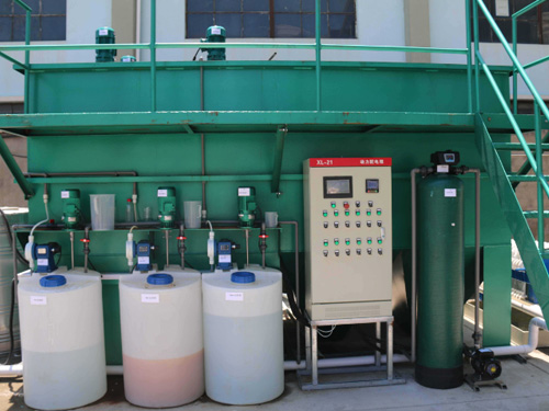 4、在鈣式除磷系統(tǒng)中,加入氫氧化與氫氧化鈣(其配比經(jīng)調(diào)式確定,可先按1:1比例進行調(diào)試),其PH值控制范圍為9—11(具體控制值經(jīng)調(diào)試 確定),而后廢水進入混凝沉淀系統(tǒng);